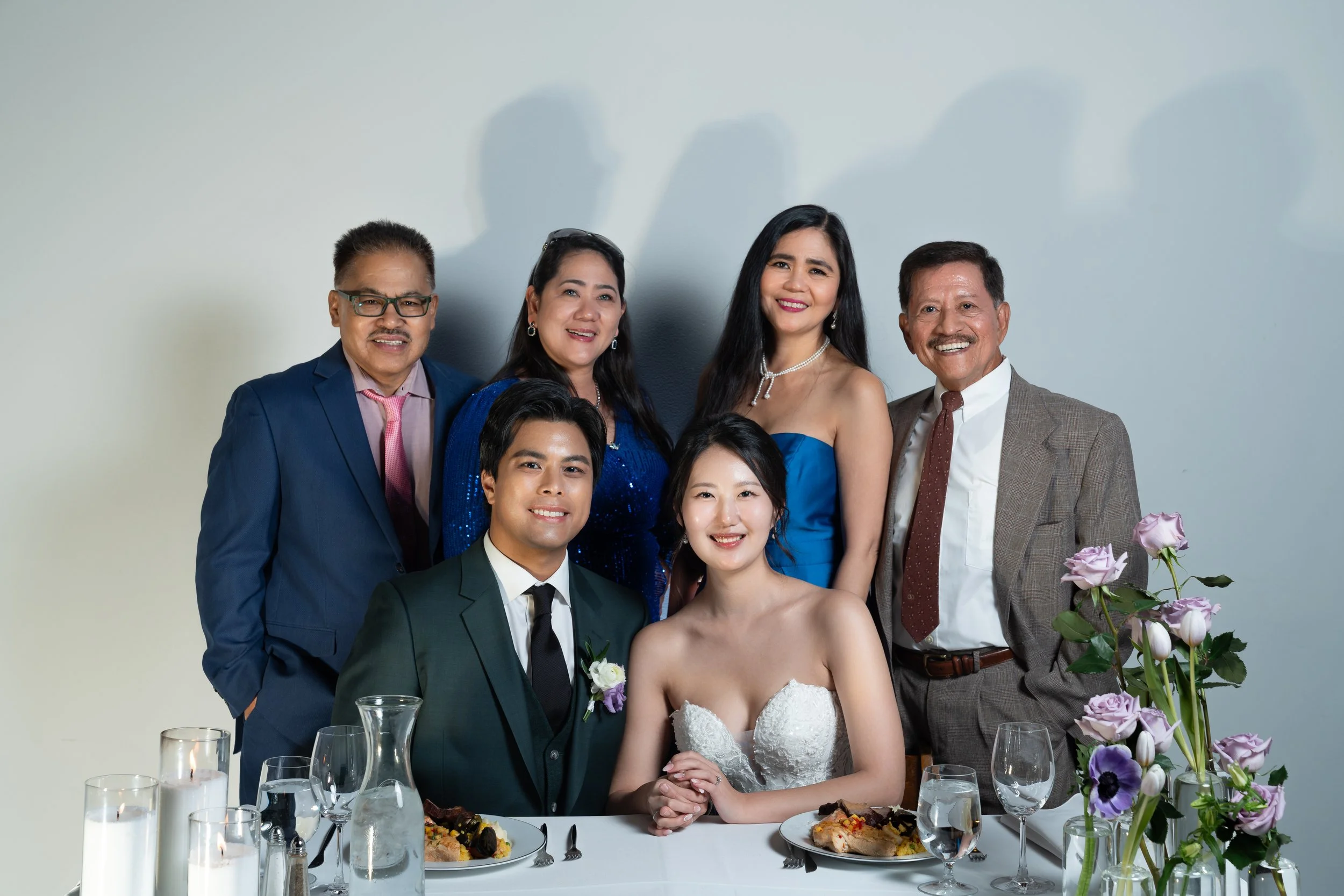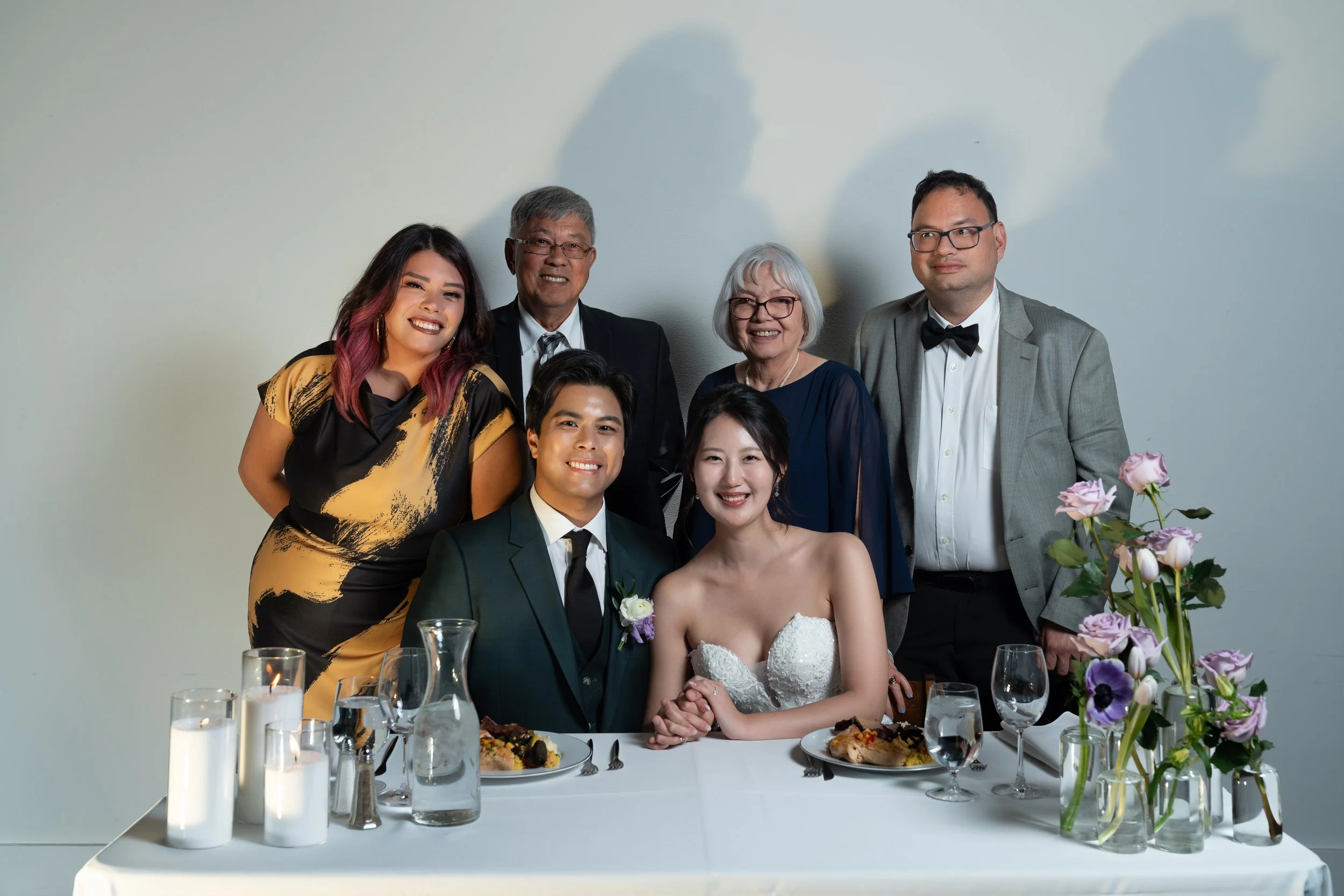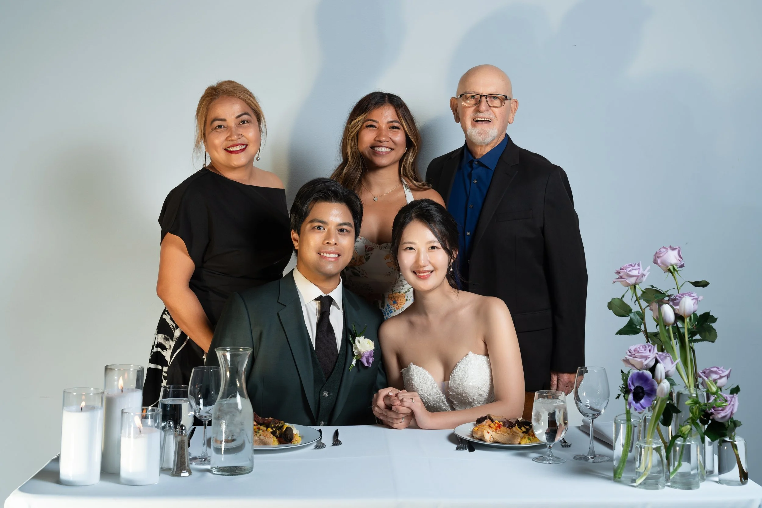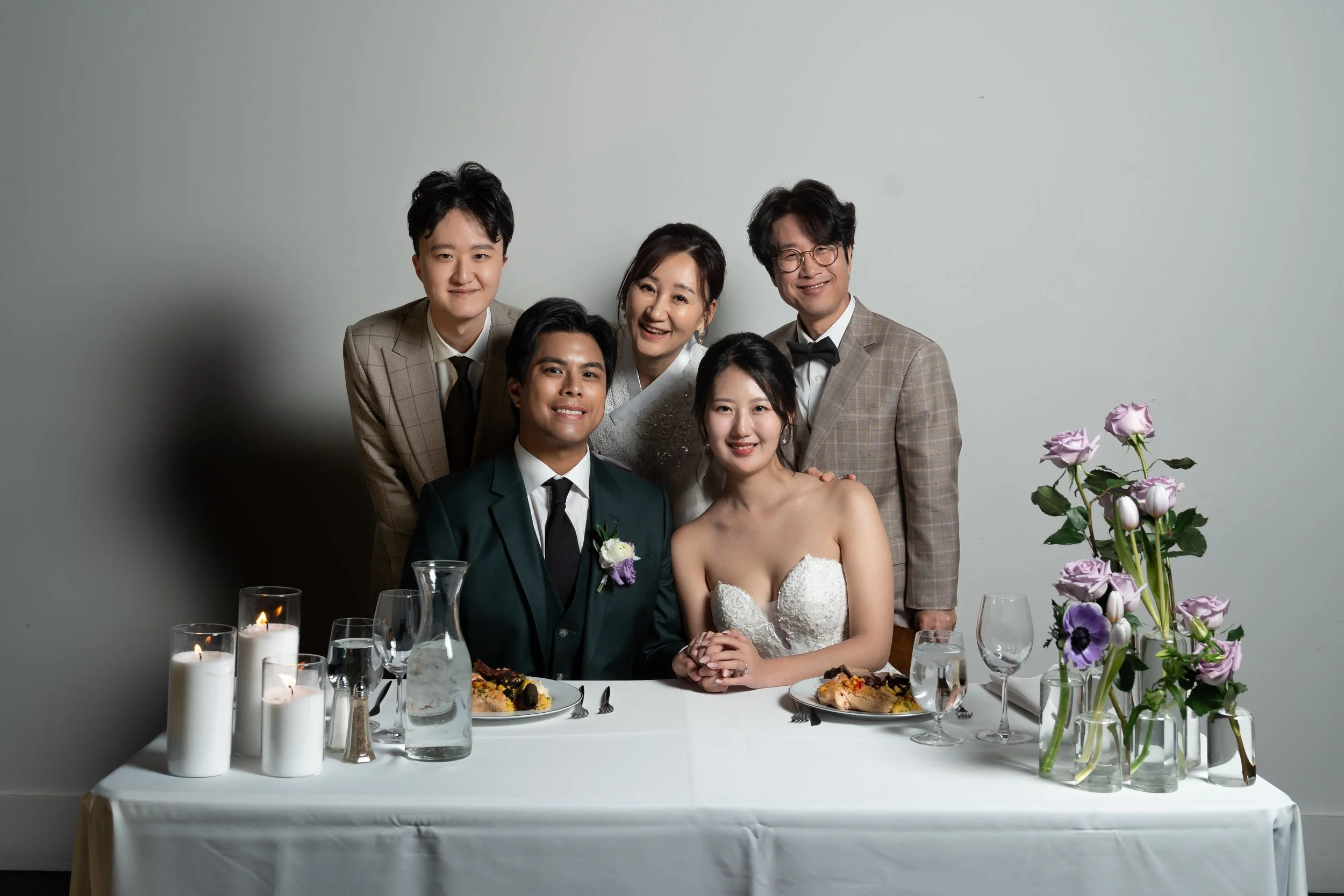 A bride and groom seated at a table with four family members or friends standing behind them. The table has lit candles and floral arrangements with purple flowers. The group is dressed in formal attire, with the groom in a green suit and the bride i