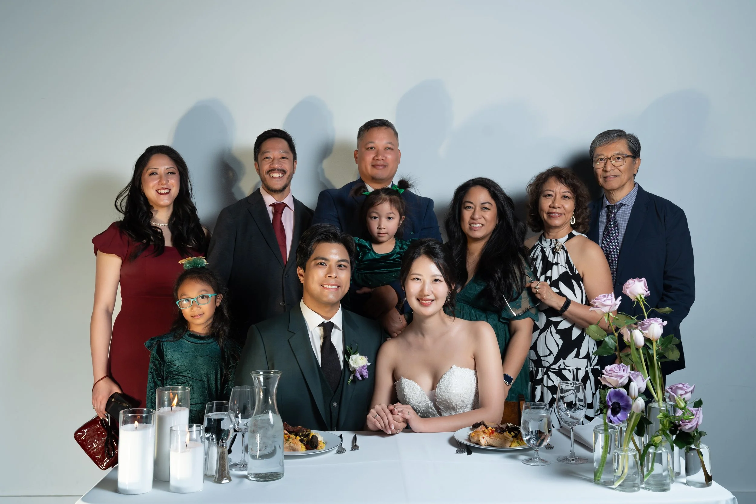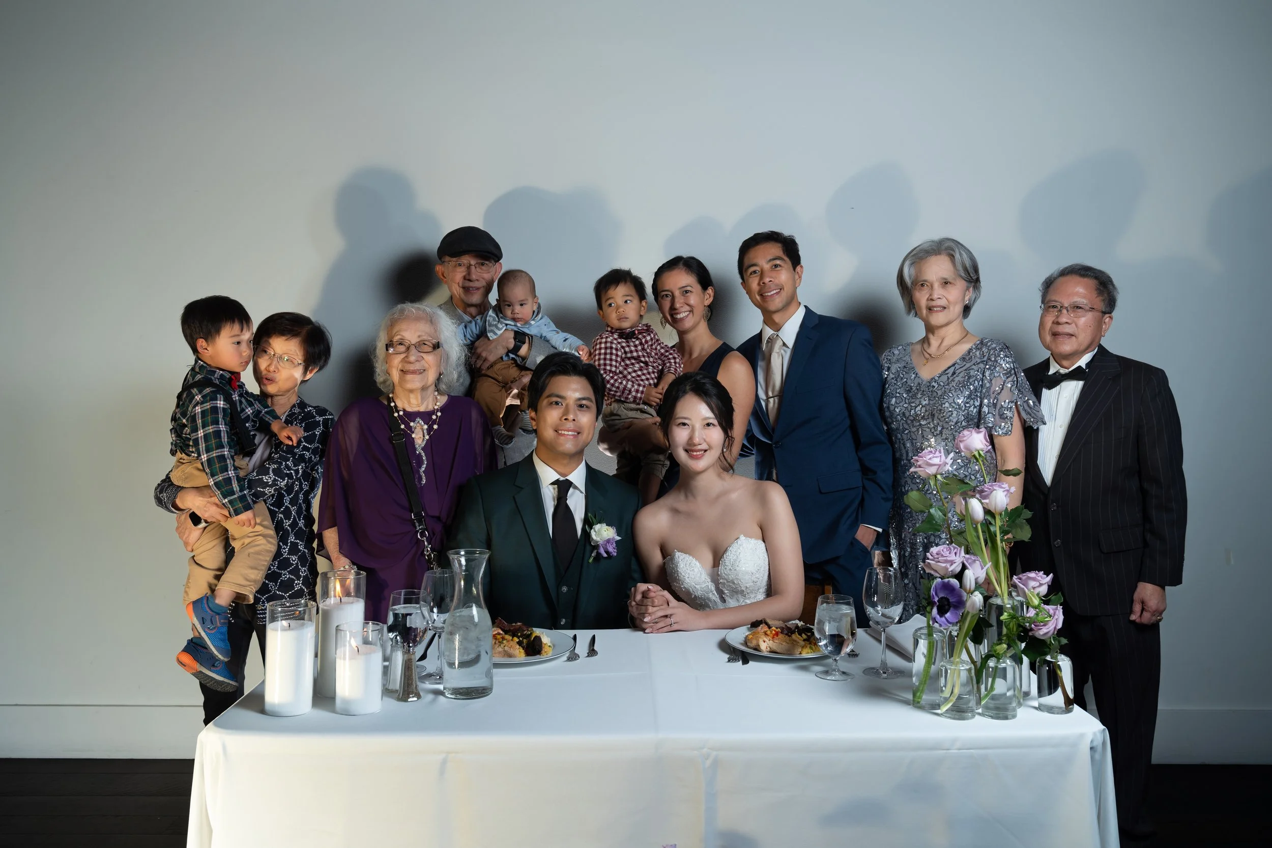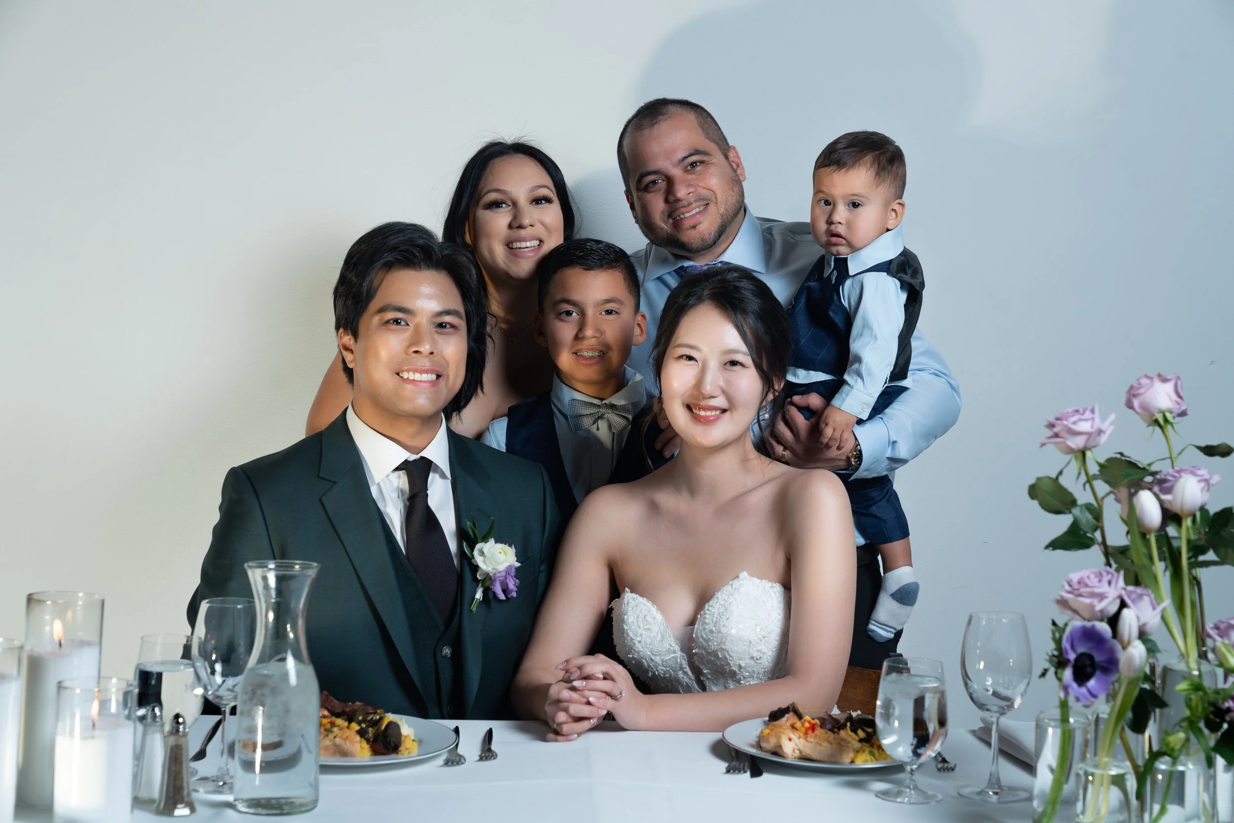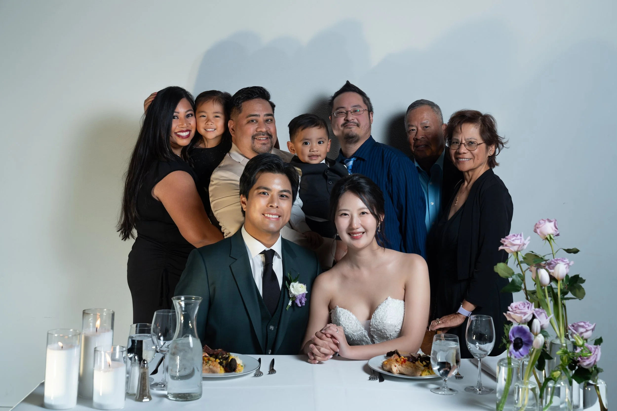 Group photo at a wedding with a bride and groom sitting at a table with food, surrounded by family members, including adults and children. The table has candles and a floral arrangement with purple roses.