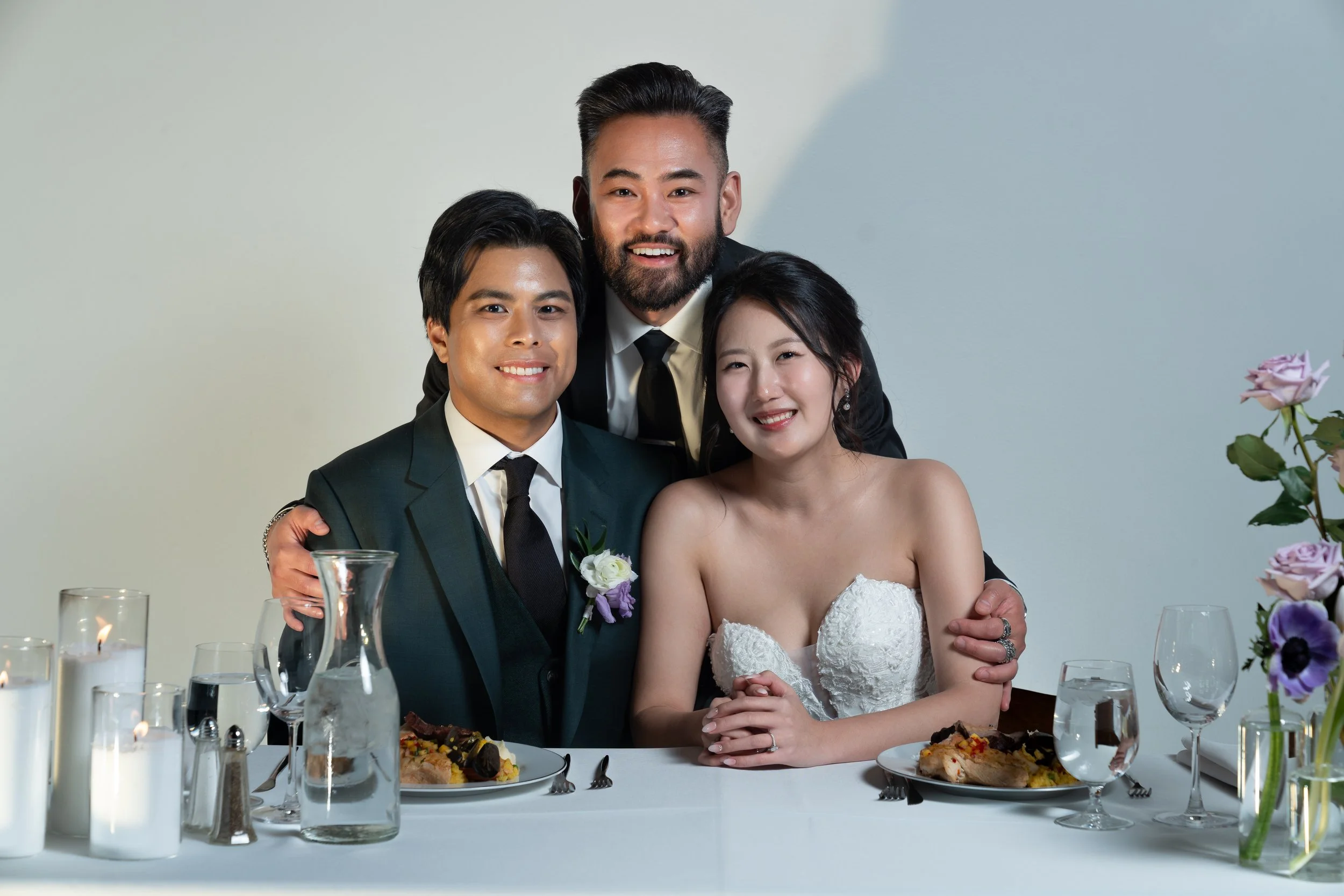 A newlywed couple and a groomsman smiling at a wedding reception table, with flowers and candles.