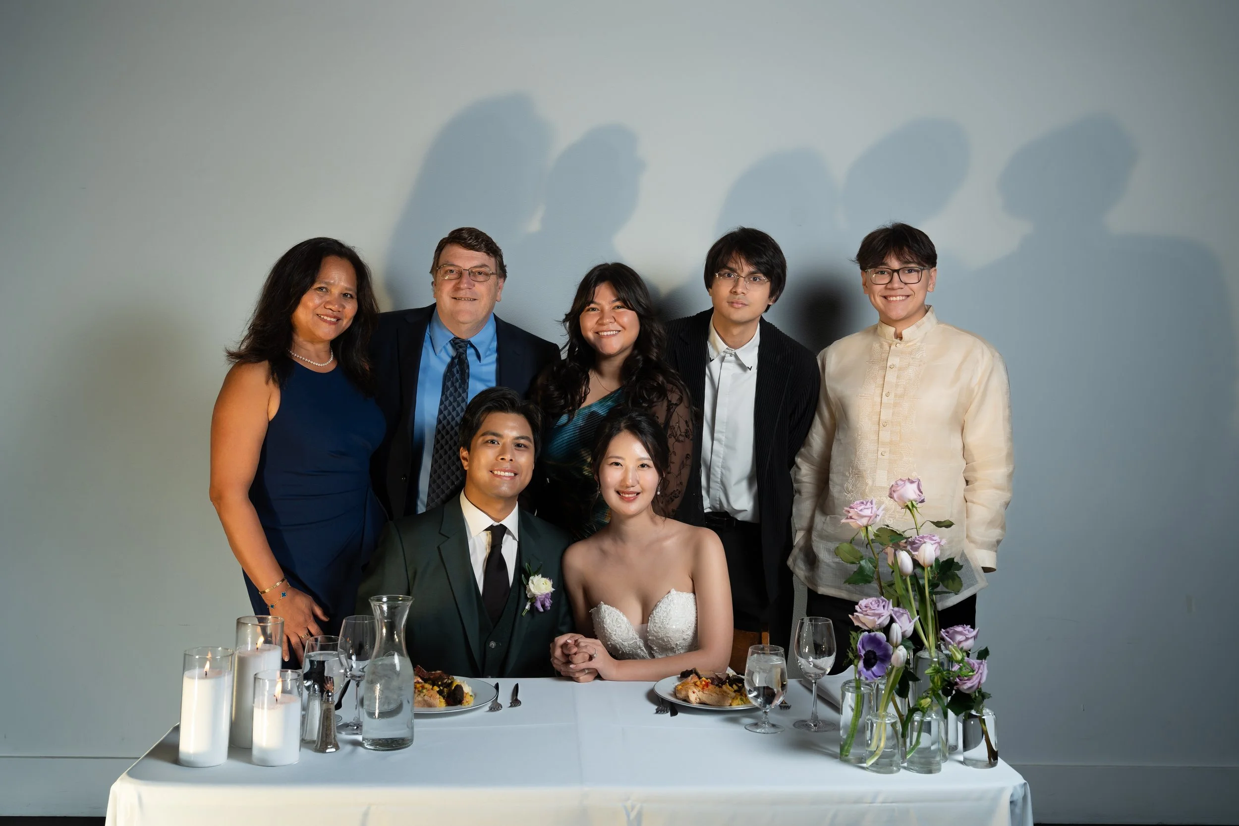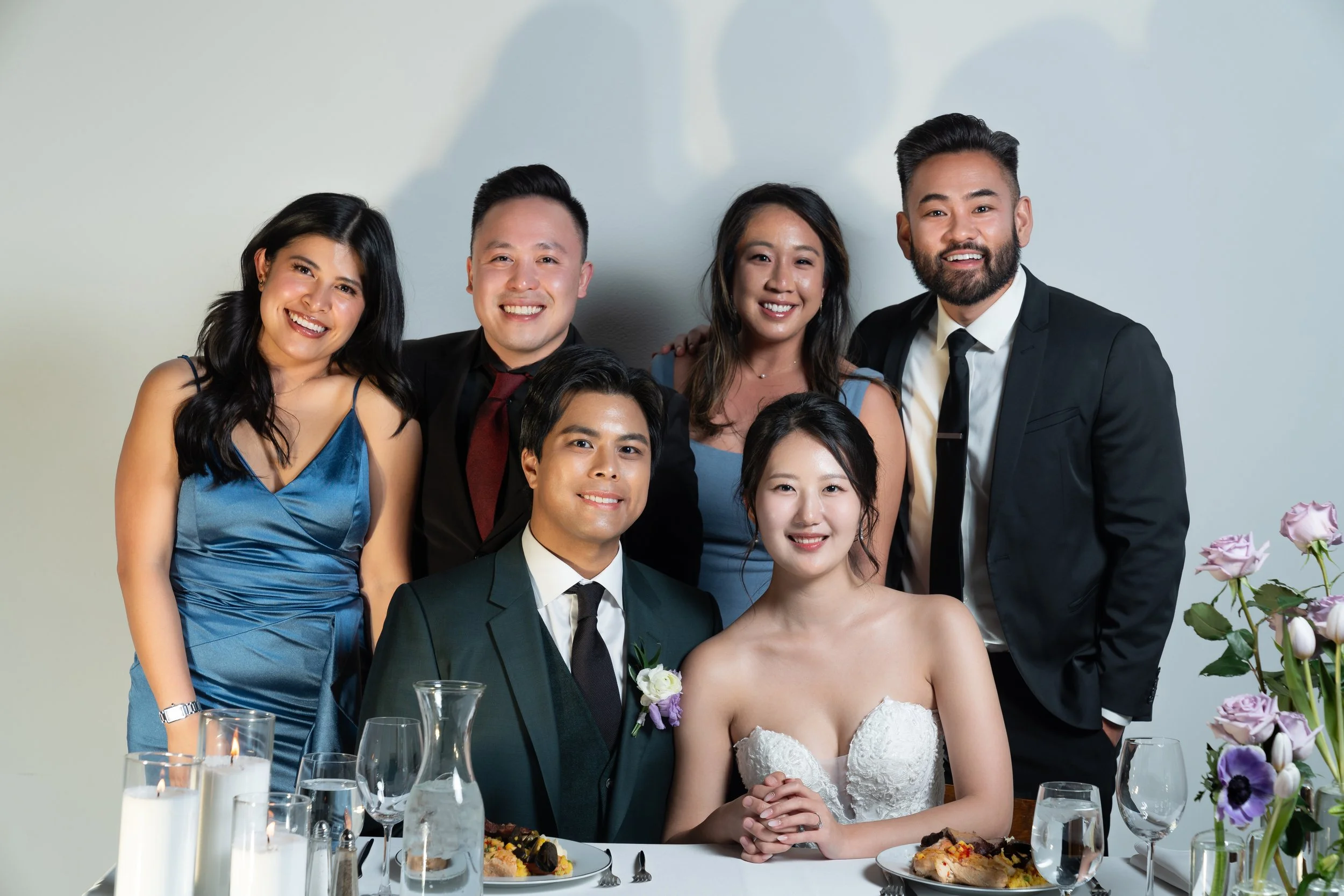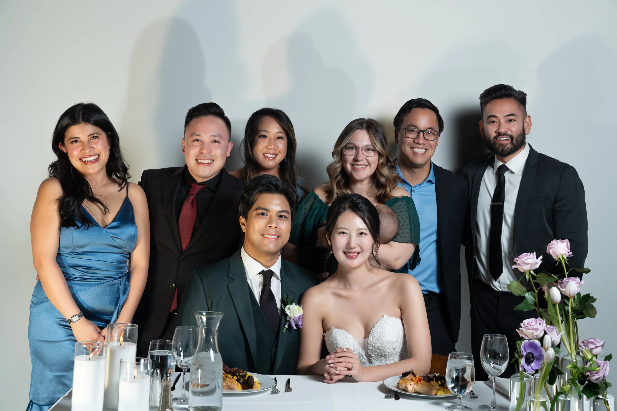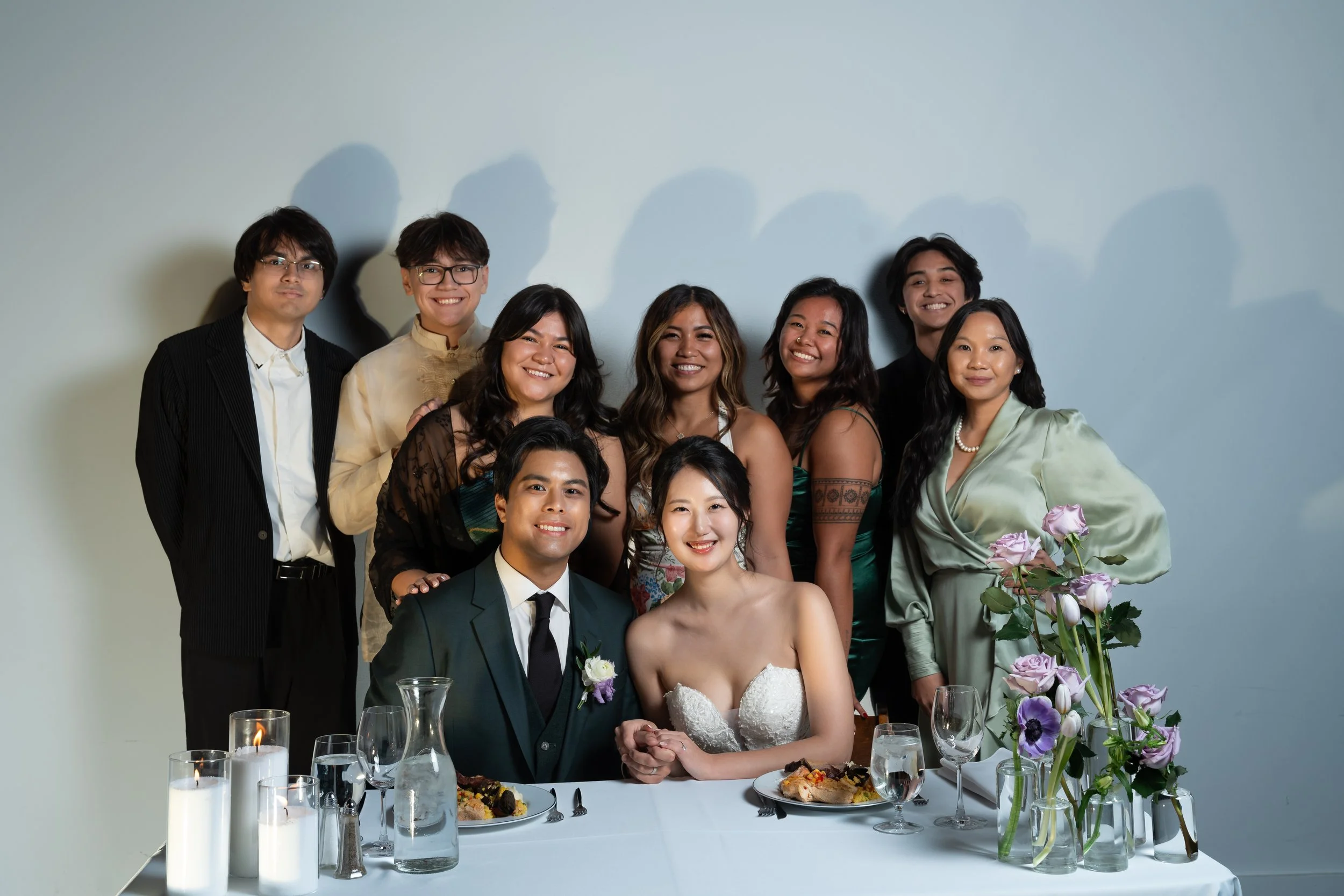 Group photo of a wedding celebration with a bride and groom seated at a table, surrounded by eight people standing behind them. The table is set with plates of food, candles, and a floral arrangement.
