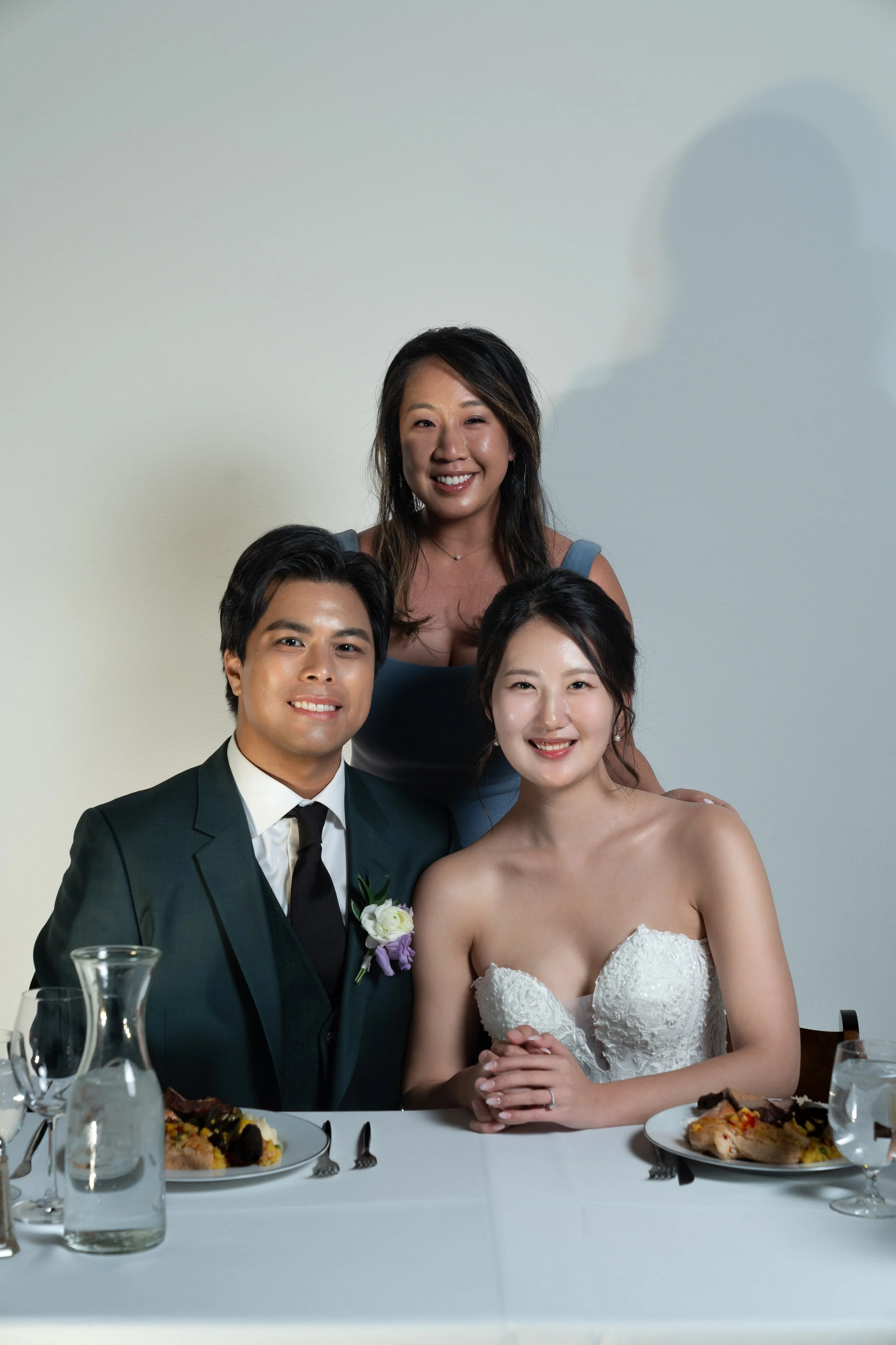 Three people in formal attire at a dining table, two seated and one standing behind them. The seated individuals are in wedding attire, with a bride in a white dress and a groom in a dark suit. The person standing is smiling.