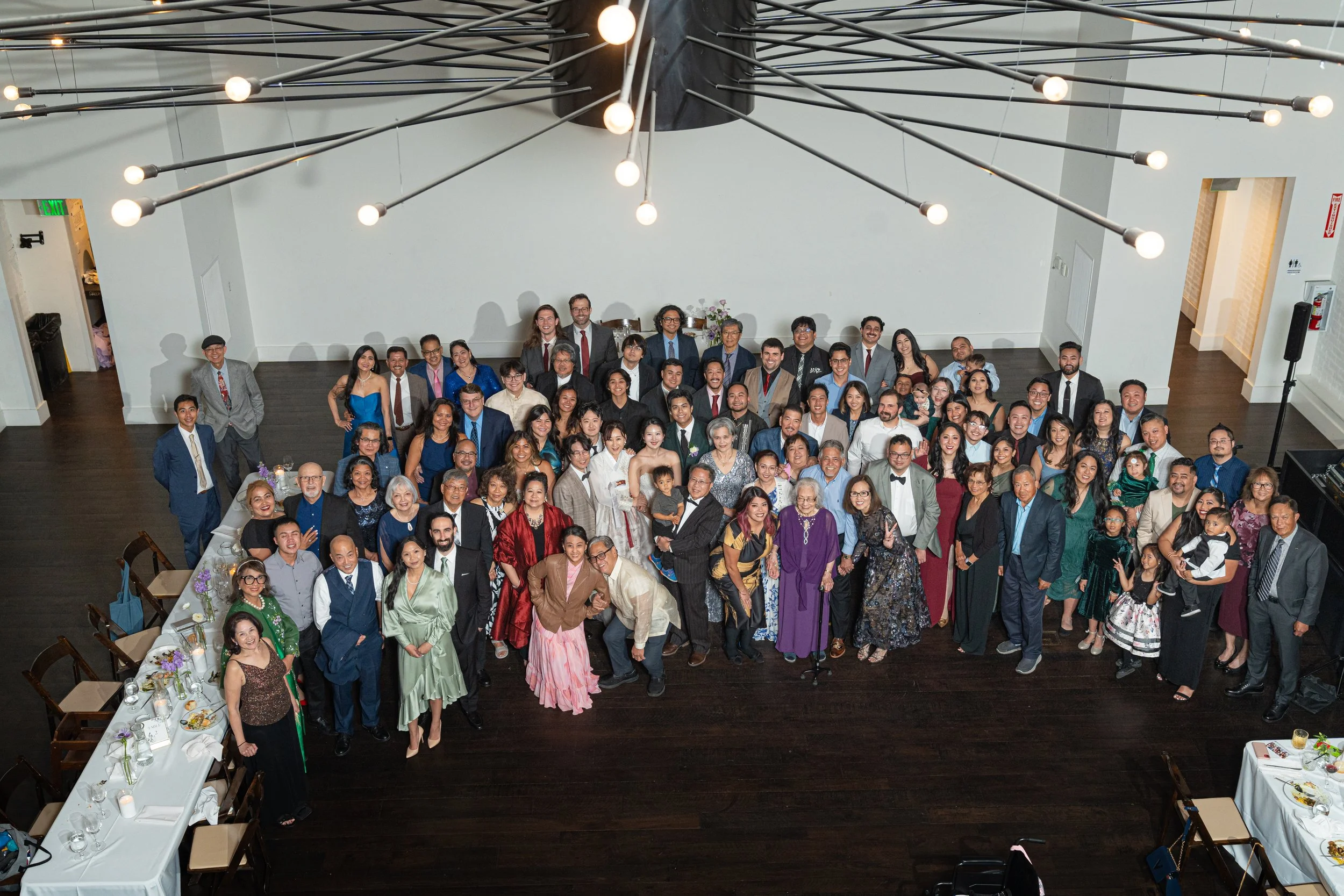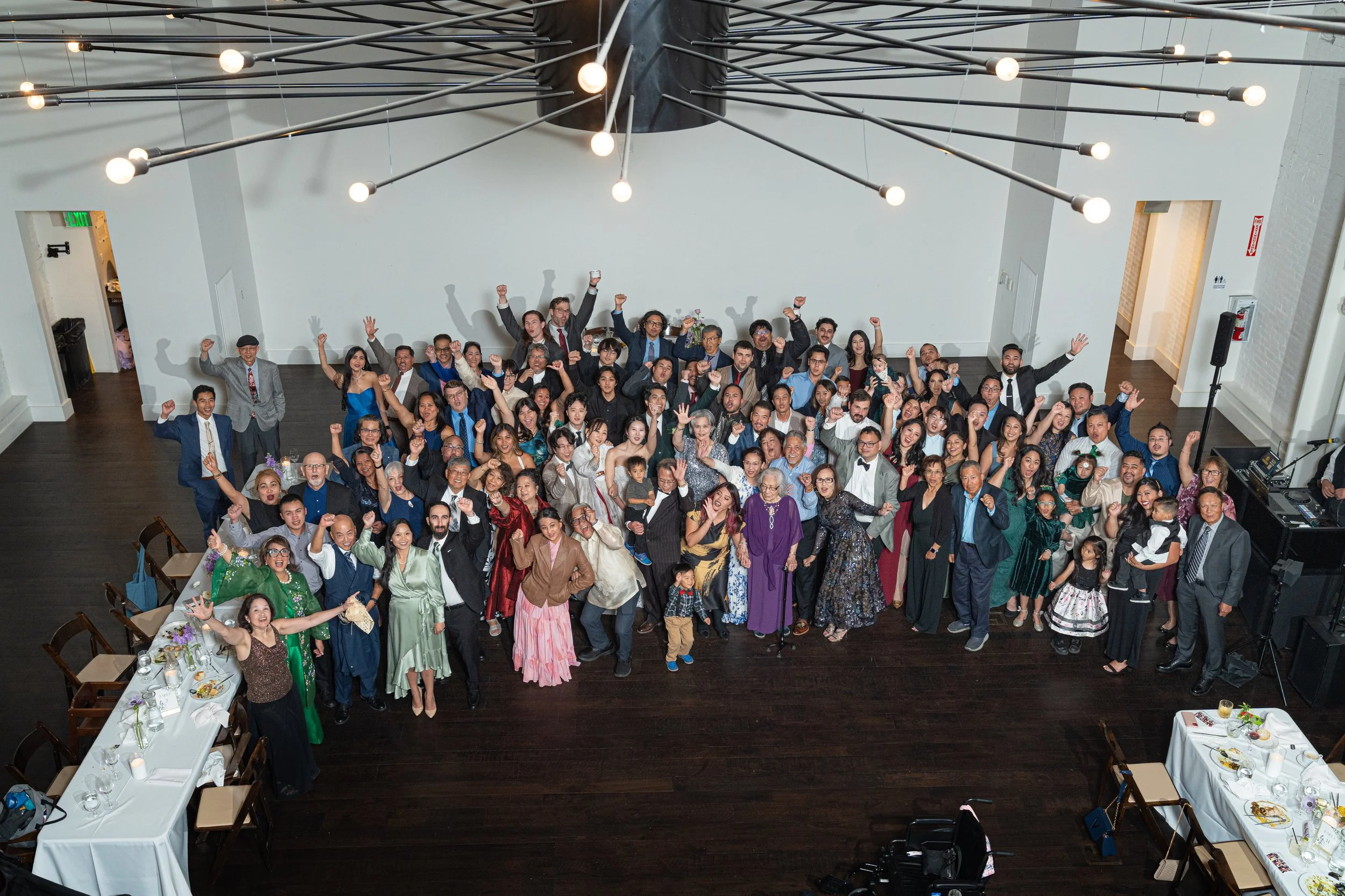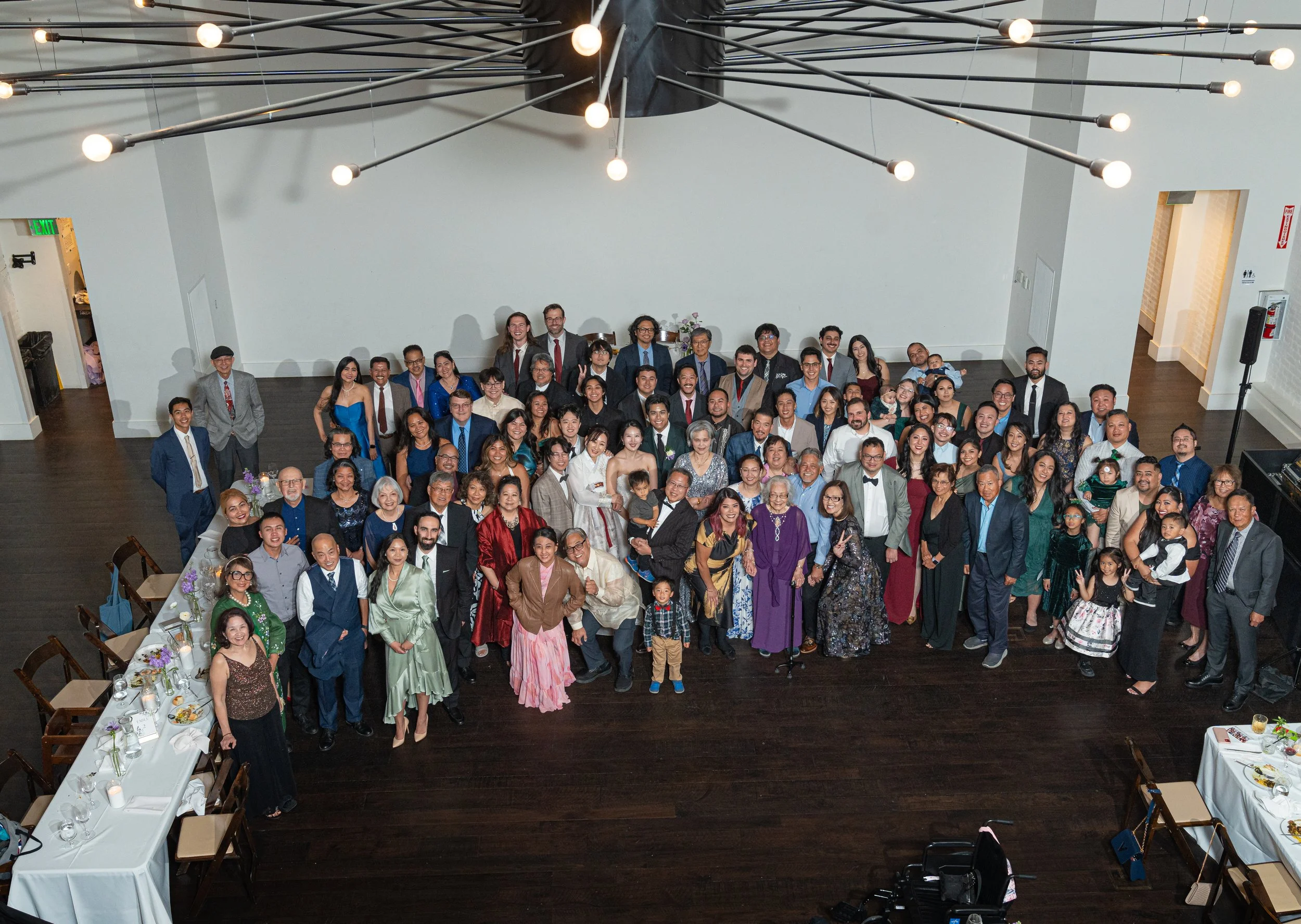Large group of people posing in a formal setting, likely a wedding or event, with tables and chairs visible.