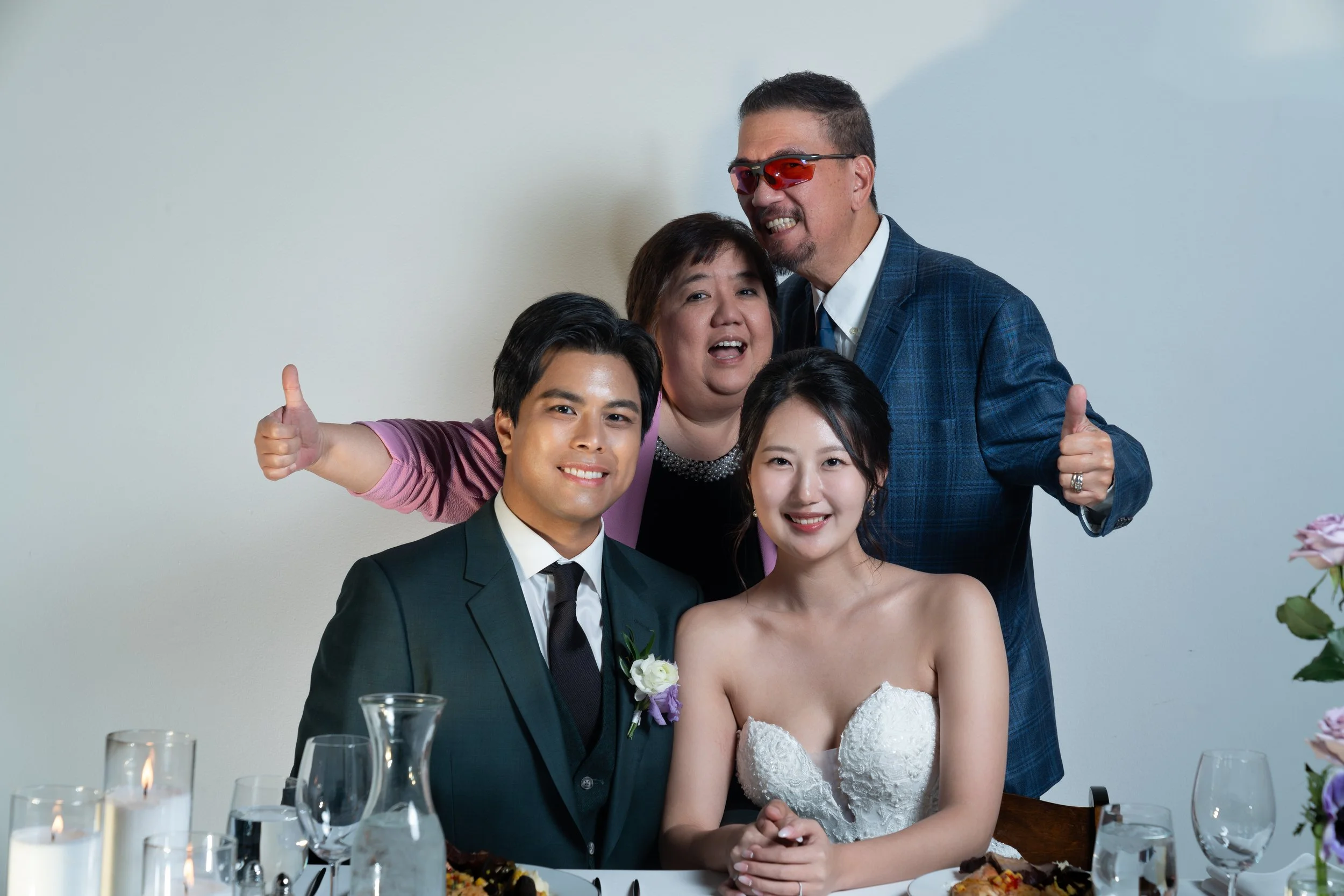 Two couples at a wedding reception, with the bride and groom seated in front and the other couple standing behind, smiling and giving thumbs up. Wedding attire and table with candles and glasses visible.