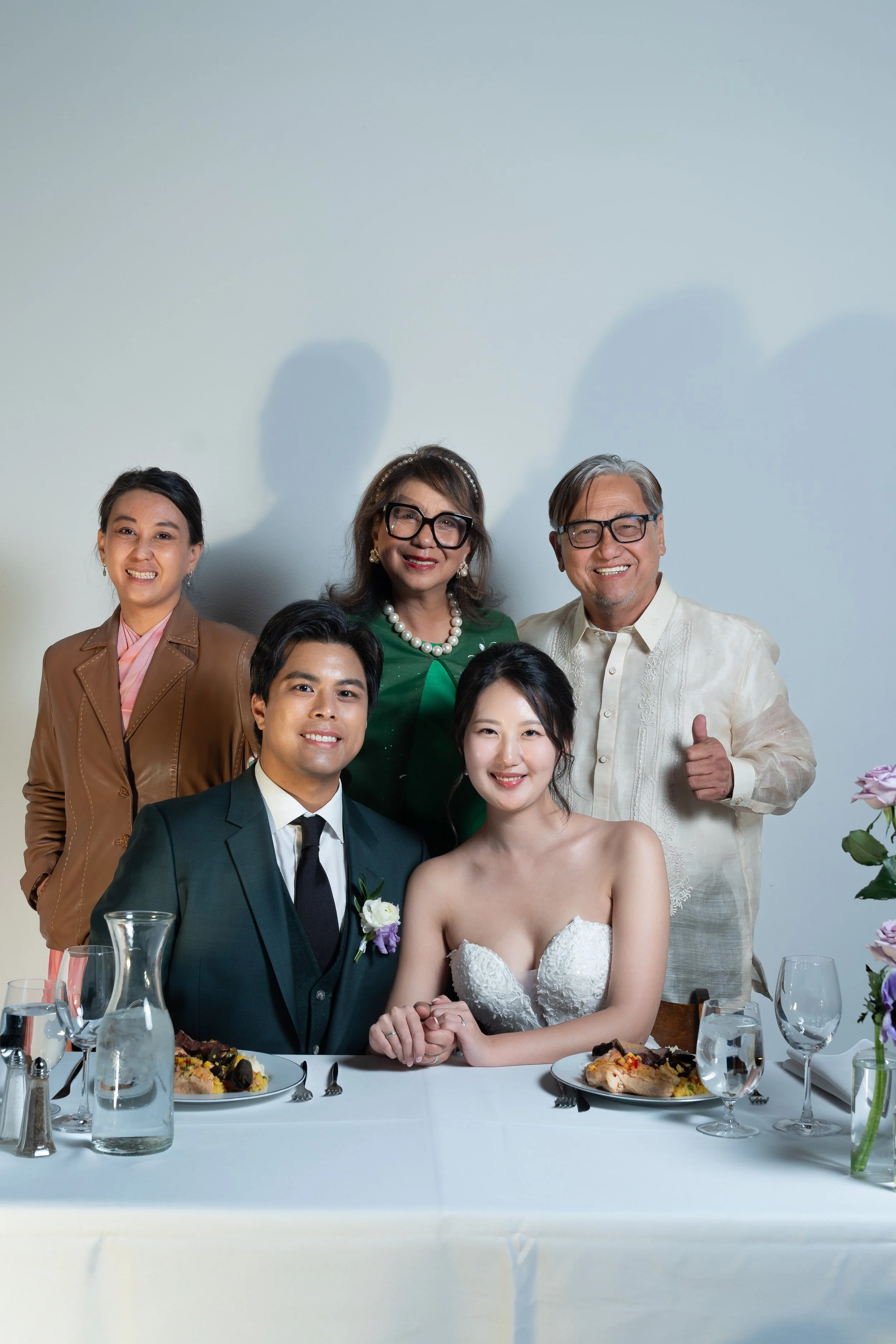 A wedding couple seated at a table with two guests standing behind them. The groom is wearing a green suit and the bride is in a white strapless gown. The table is set with plates, glasses, and a water pitcher.