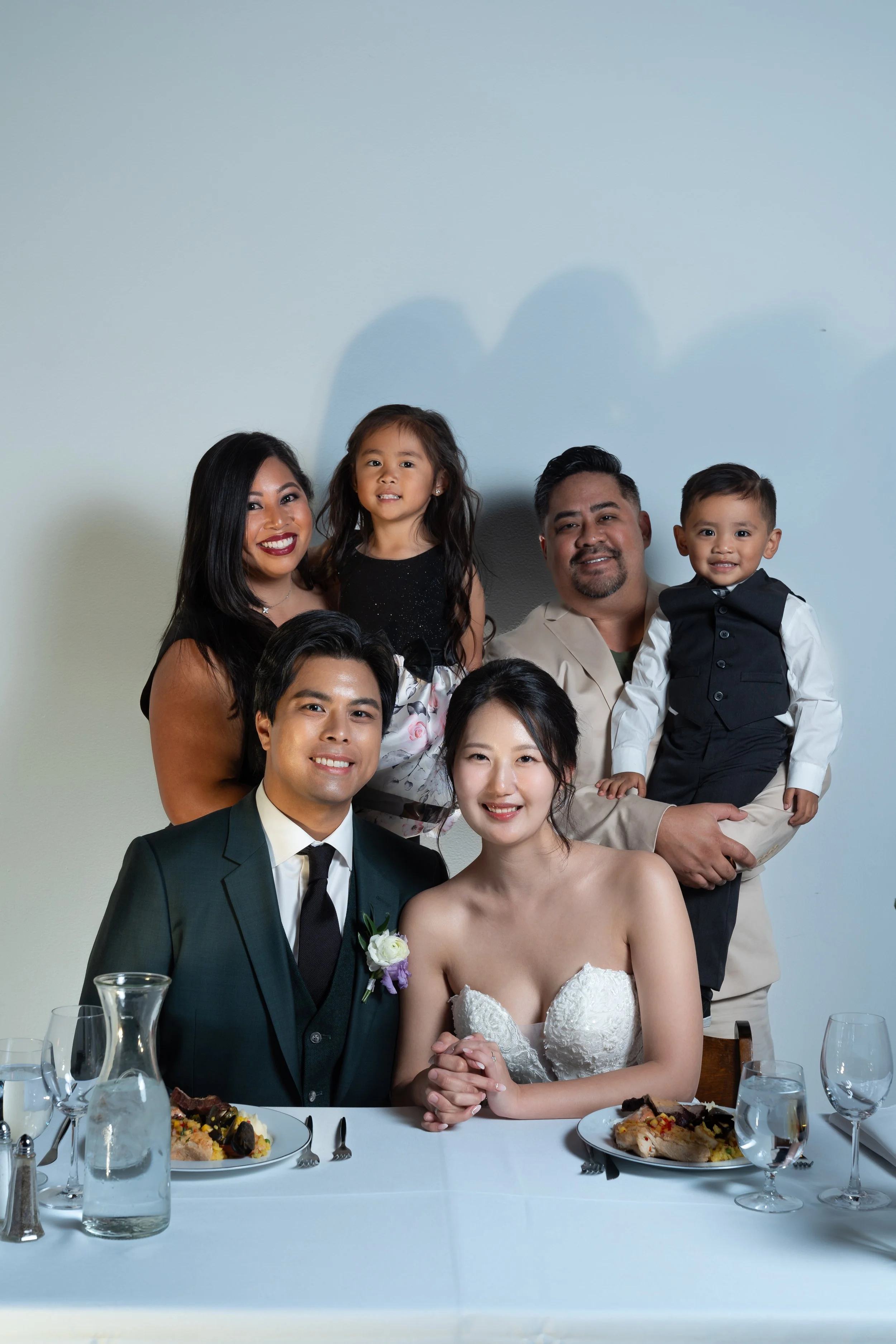 Wedding couple seated at a table with well-dressed guests standing behind them, smiling and posing for a photo. The table has plates of food, water glasses, and a carafe.