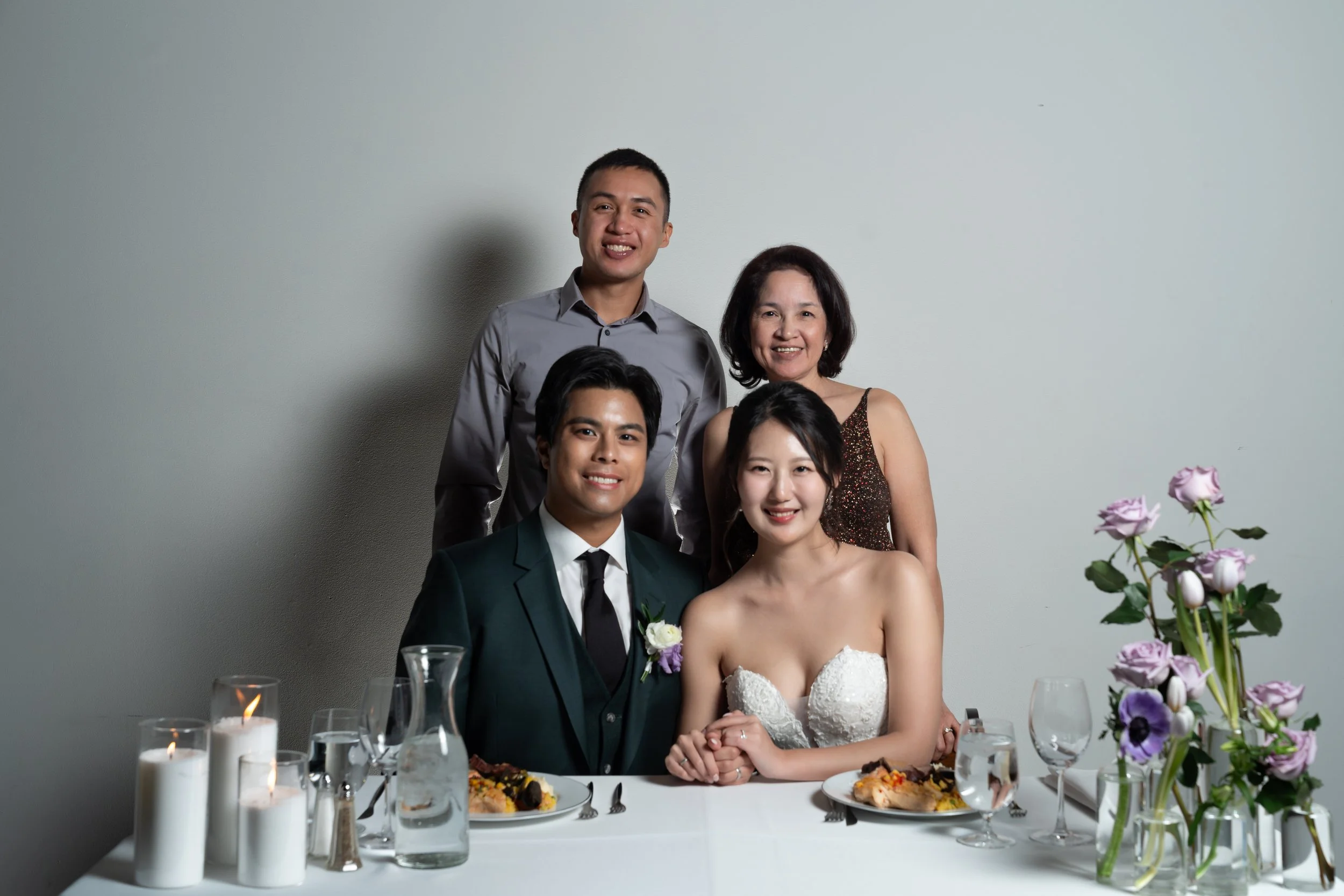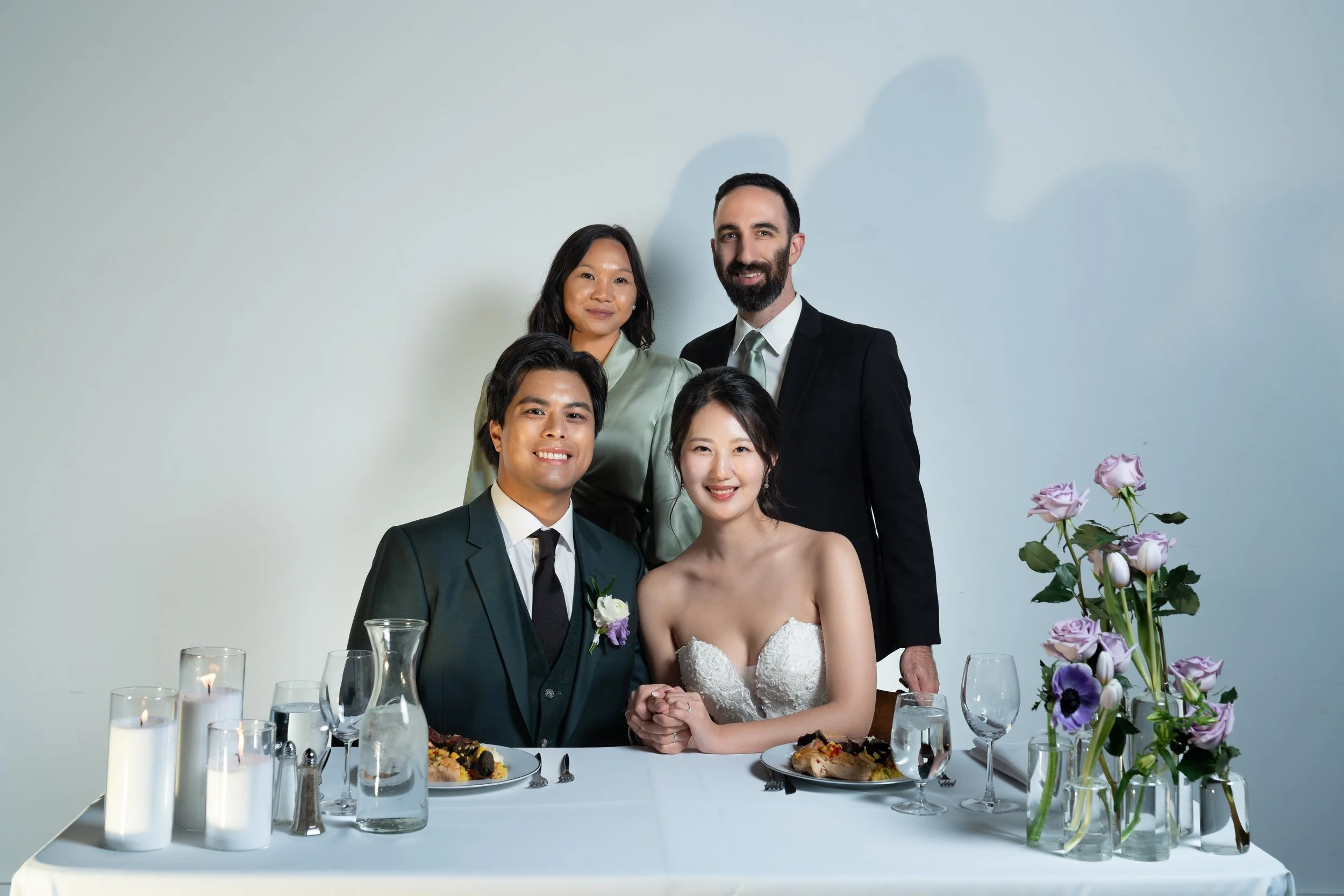 A wedding couple seated at a table with two guests standing behind them. The table is set with plates, candles, and a vase of purple flowers. The groom is wearing a suit, and the bride is in a white dress. View fullsize