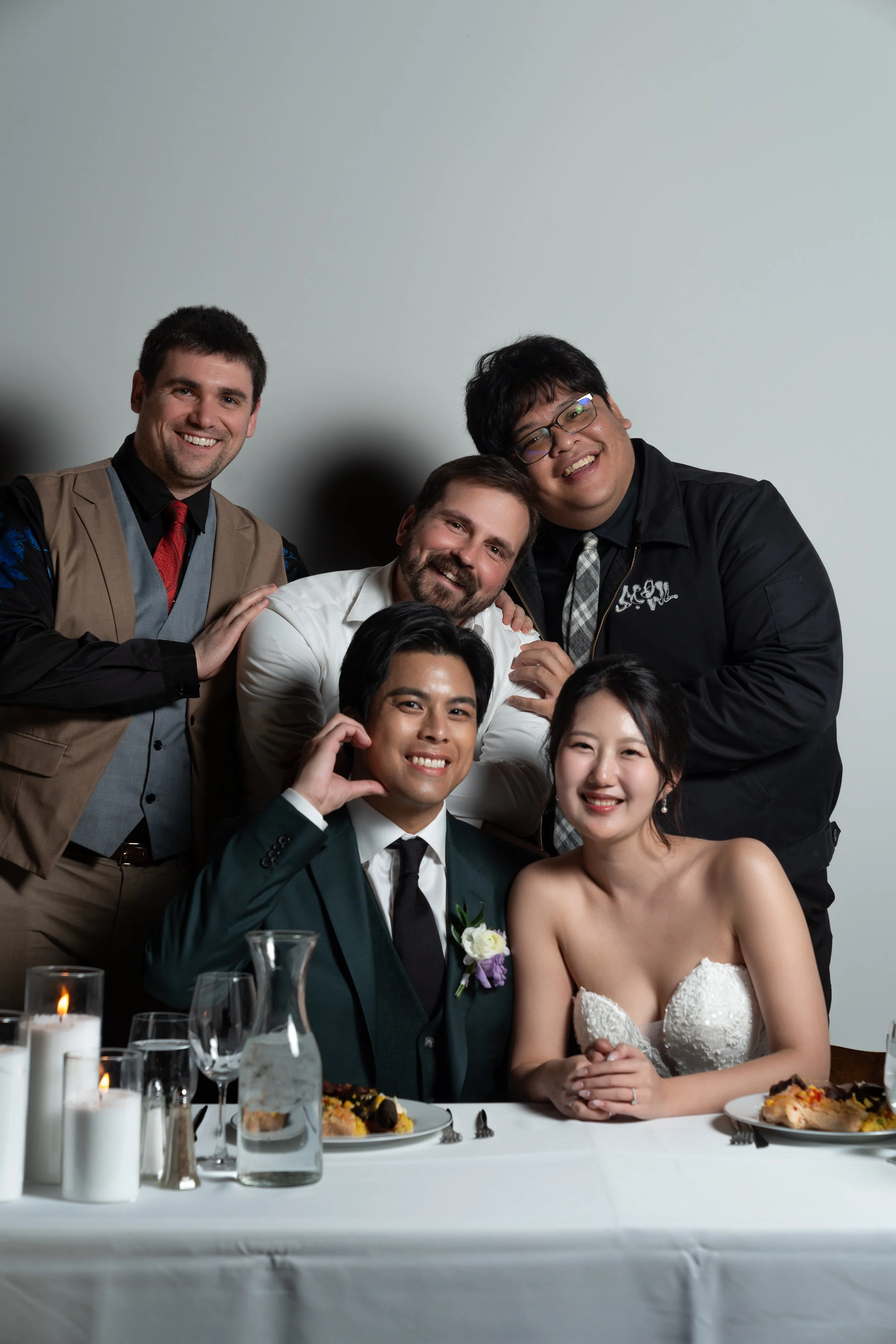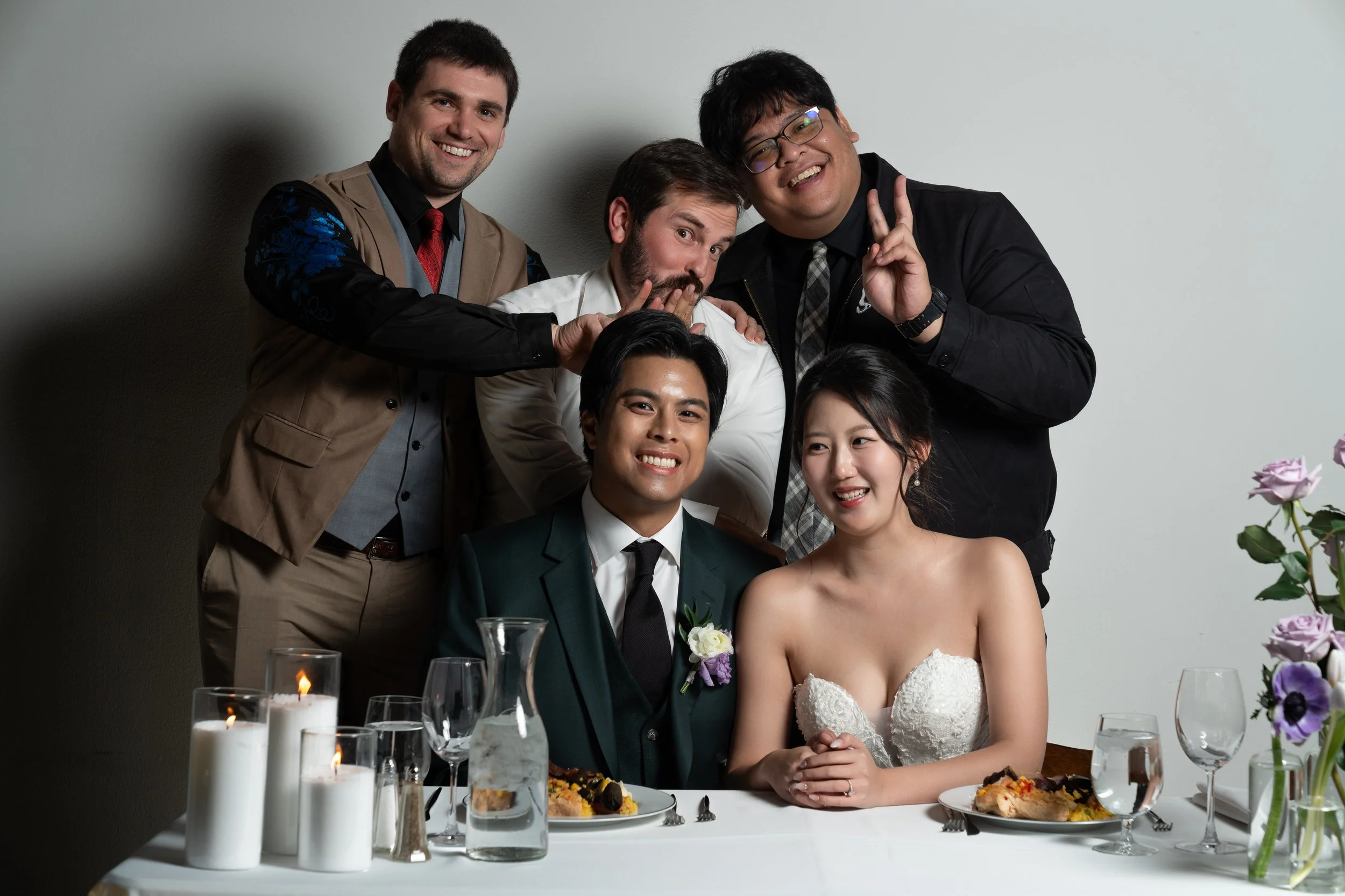 Group photo of a wedding couple seated at a table with three guests standing behind them. The table is set with plates, glasses, candles, and a floral arrangement. The guests are smiling and making playful gestures.